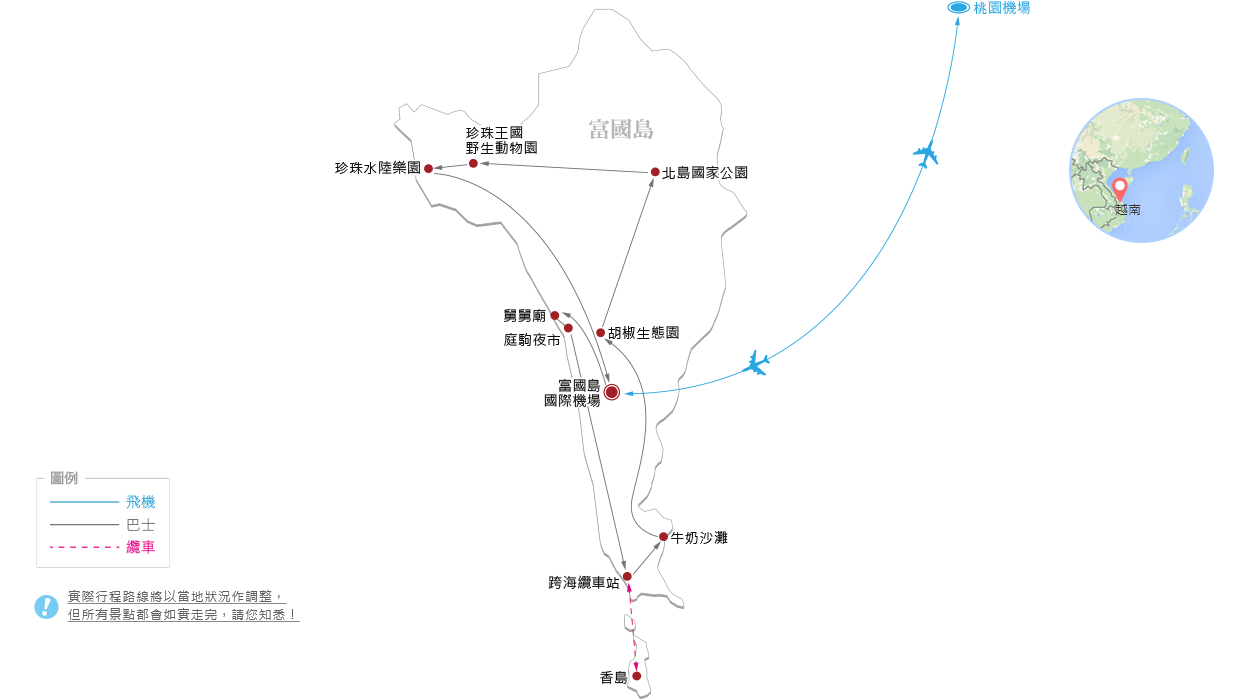| 第5天 19:25 | 第5天 23:55 | 富國島國際機場 PQC | 桃園國際機場 TPE | 台灣虎航 | IT558 |