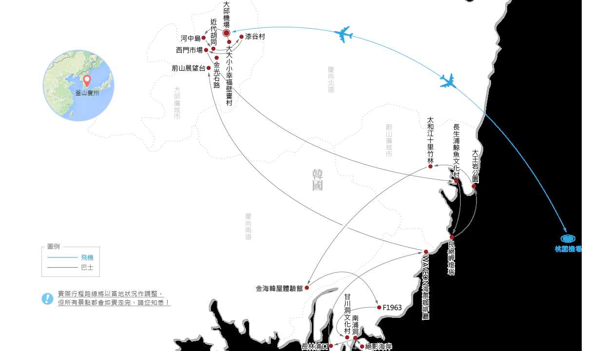 土產店→釜山"小威尼斯"彩色漁港~長林浦口→WAVEON無敵海景咖啡廳~贈送每人一杯咖啡→前山公園+前山展望台+來回纜車→文青壁畫街~金光石路→大邱國際機場/桃園國際機場 |