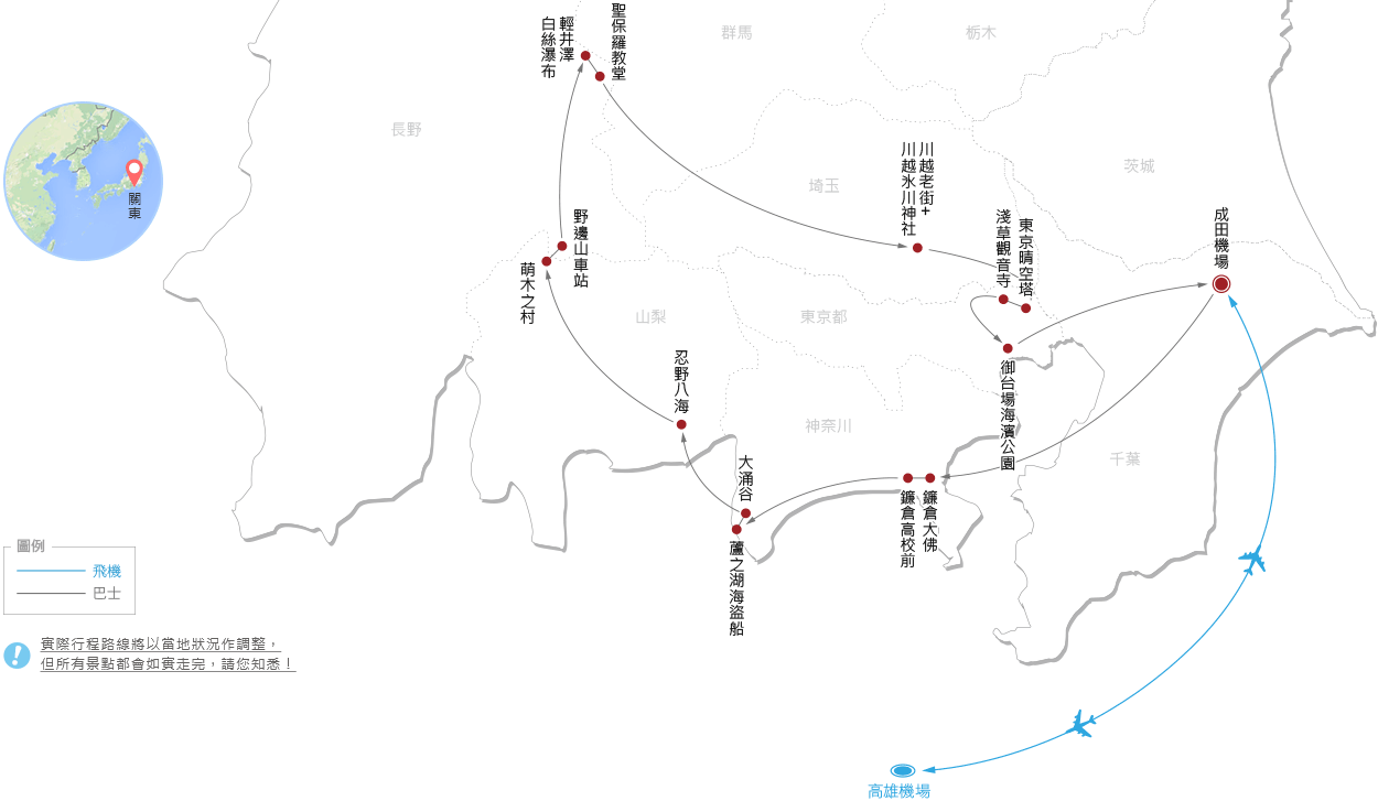 飯店→童話世界村~萌木之村→【JR日本最高海拔車站】野邊山車站→輕井澤祕境~白絲瀑布→聖保羅教堂.舊銀堂商店街→飯店 |